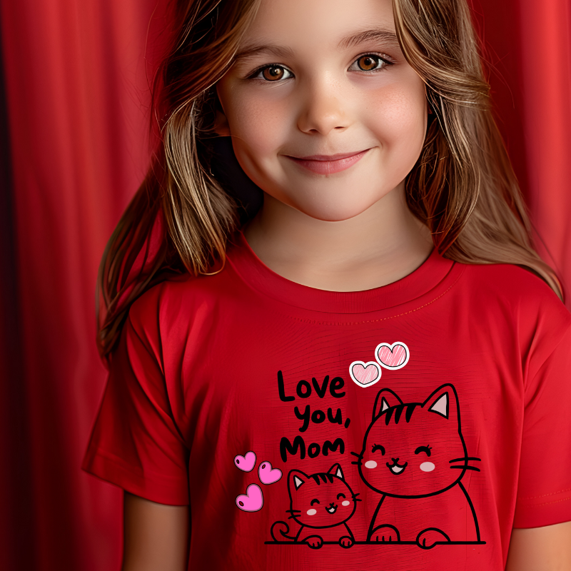 Soft 100% cotton tee with a cuddly cat and a big “Love You Mom” heart.